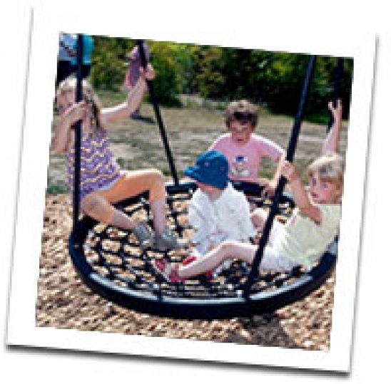 Legeredskaber på legepladsen: Gynge, tog, flyvemaskine, klatrestativ med rutchebane, spilophøne og fjedervippe.